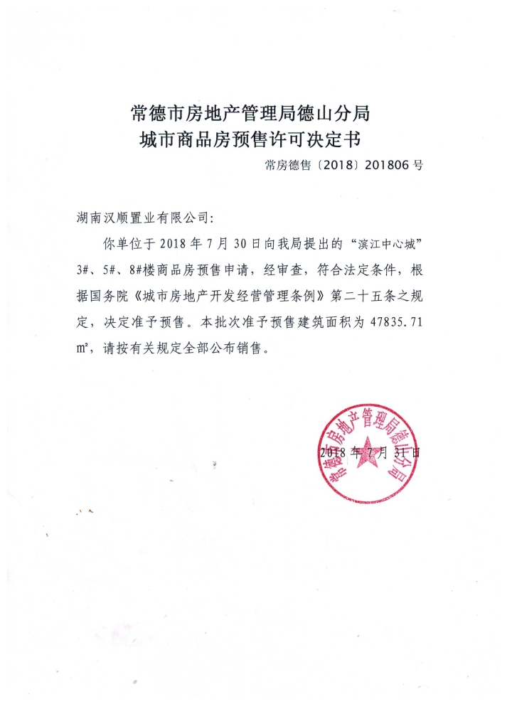 常德市房地产管理局德山分局城市商品房预售许可决定书(常房德售〔2018〕201806号)